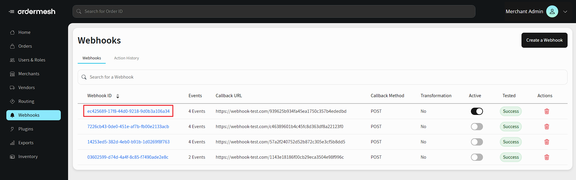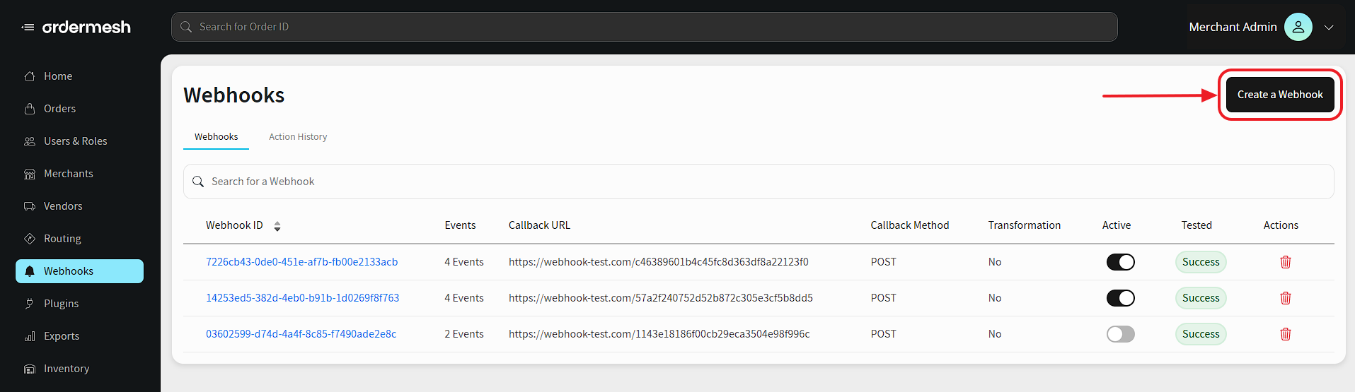 To configure your Webhooks, once you’re logged in, go to the left side Admin panel and click on Webhooks. From there, you can subscribe to an event by creating your first Webhook.