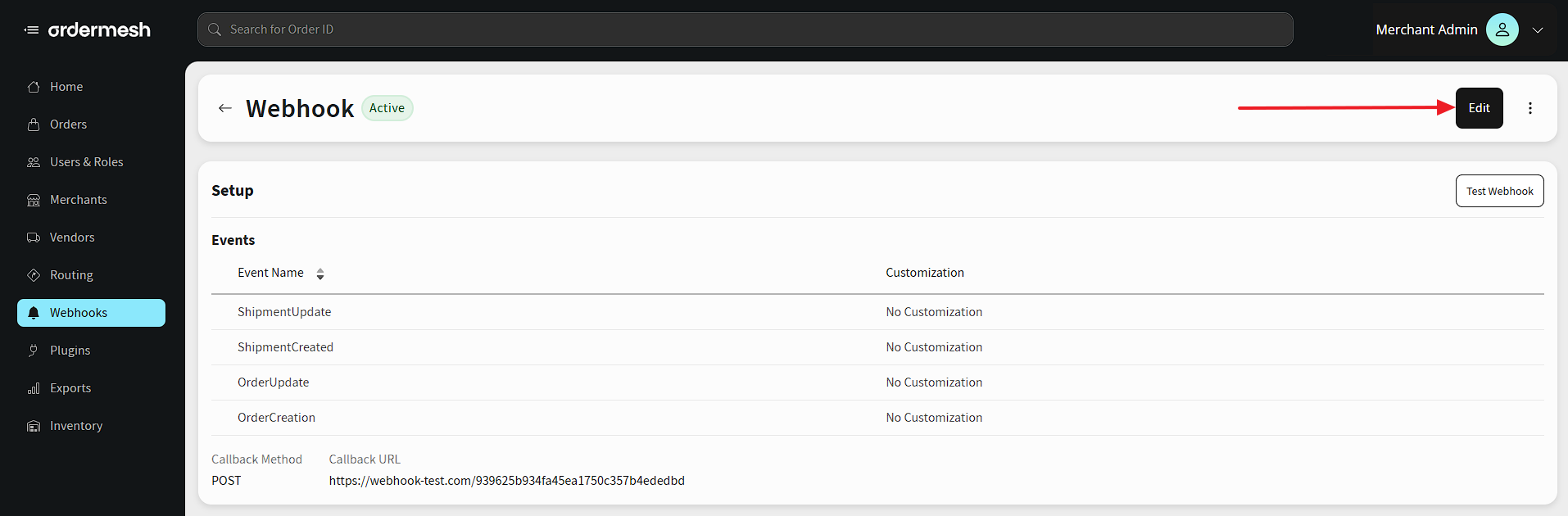 You also have the option to customize the Webhook payload so the values you receive are matching your system needs. First you need to configure and publish a webhook. Then you need to access the edit mode by clicking on Webhook ID and Edit button: